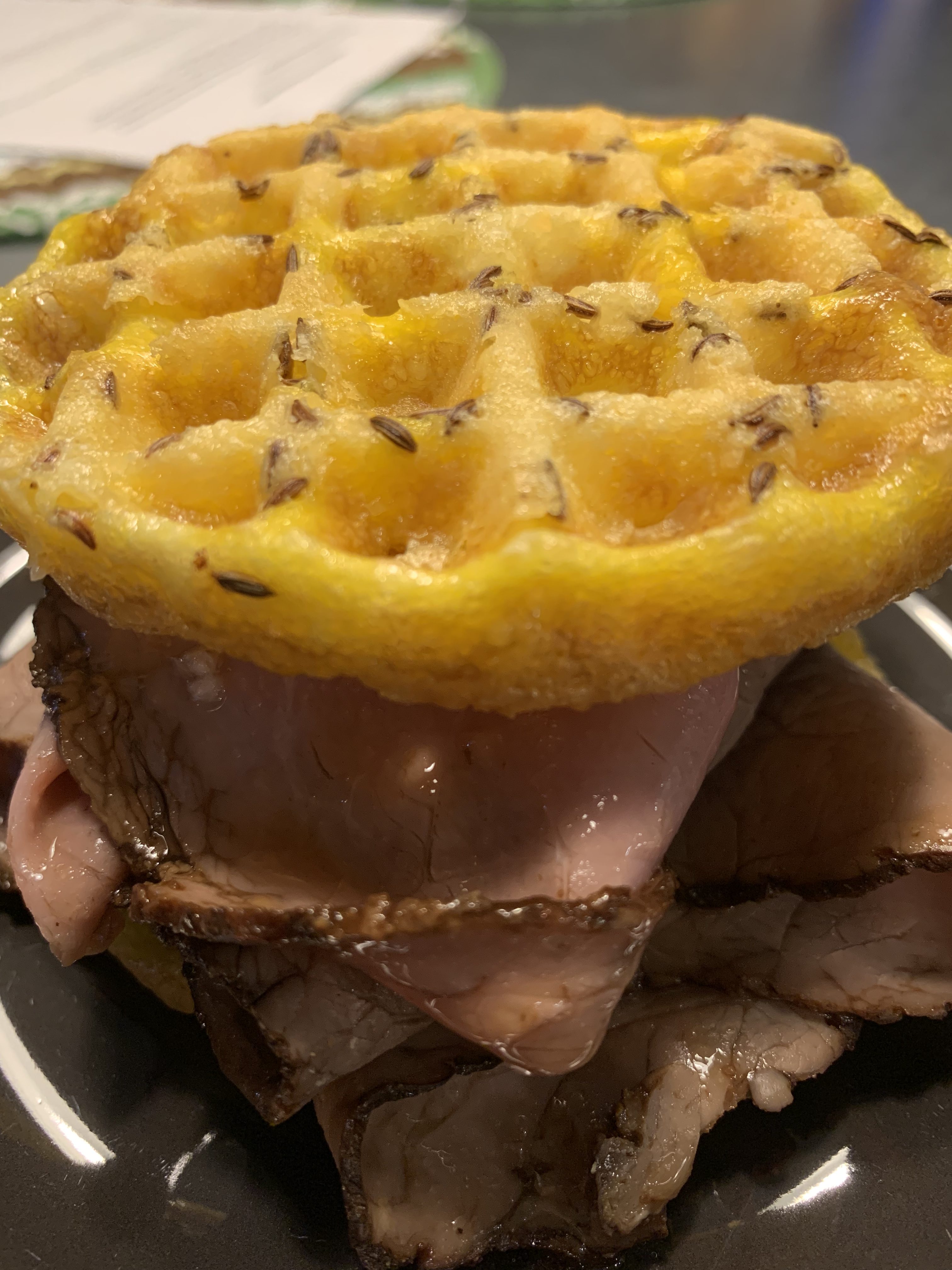 Being keto, I figured that Beef on Weck was lost to me. I tried a version with cloud bread, but it didn’t hold up well to the au jus. I considered one with a fathead roll, but it just seemed like it would be too dense. When the chaffle trend exploded, it occurred to me that I could actually make a kimmelweck out of a chaffle. A chaffleweck, so to speak. And when those gears start turning in my brain, I only have one real option.