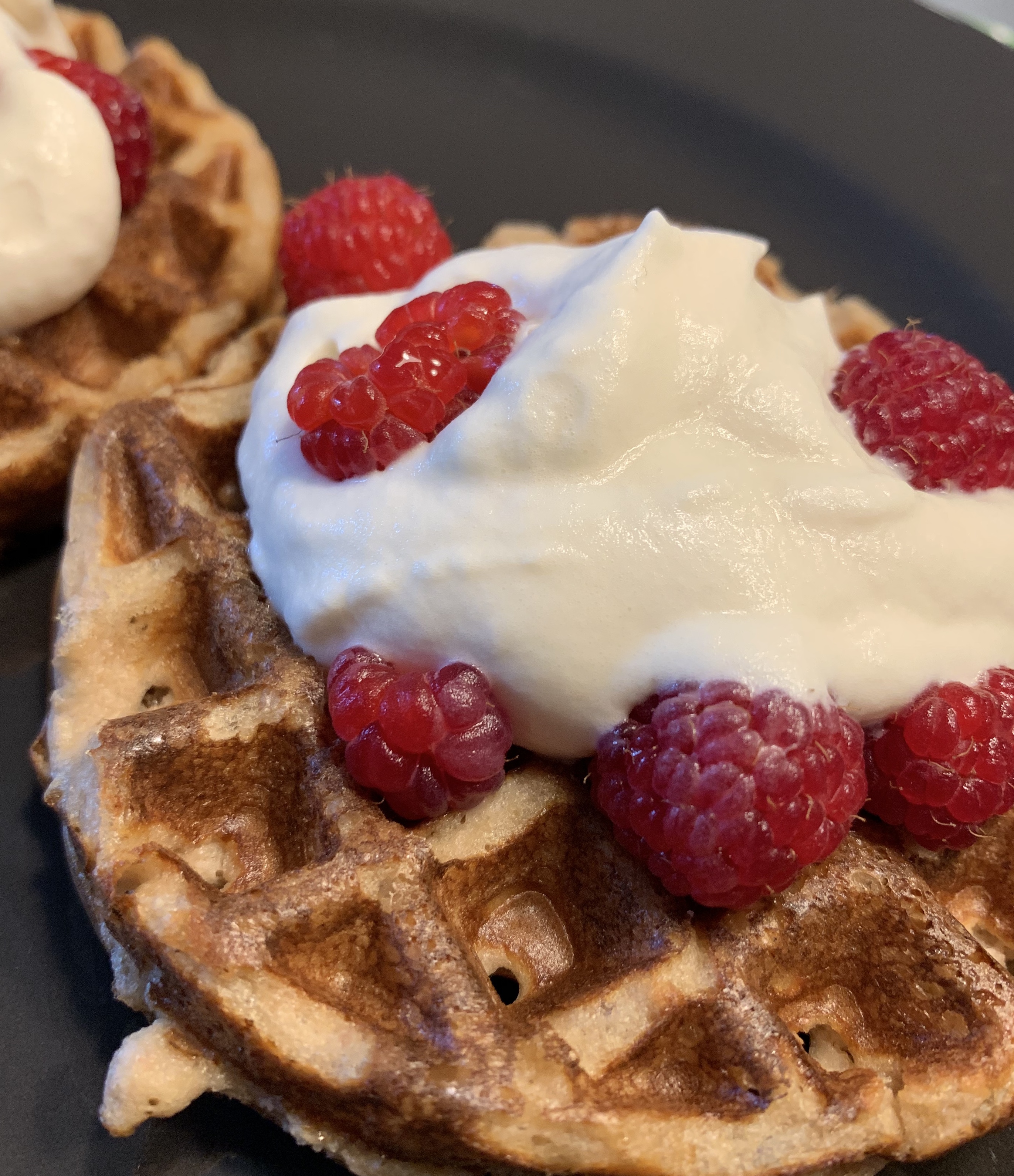 Chaffles. So hot right now. And this trend was perfectly aligned with the second harvest of raspberries from the bushes we planted when we moved into this house three years ago. I probably have at least a cup more raspberries in the fridge that I need to figure out what to do with, plus more getting ripe every day. Expect more raspberry recipes from me in the near future, I guess, is what I’m getting at here.