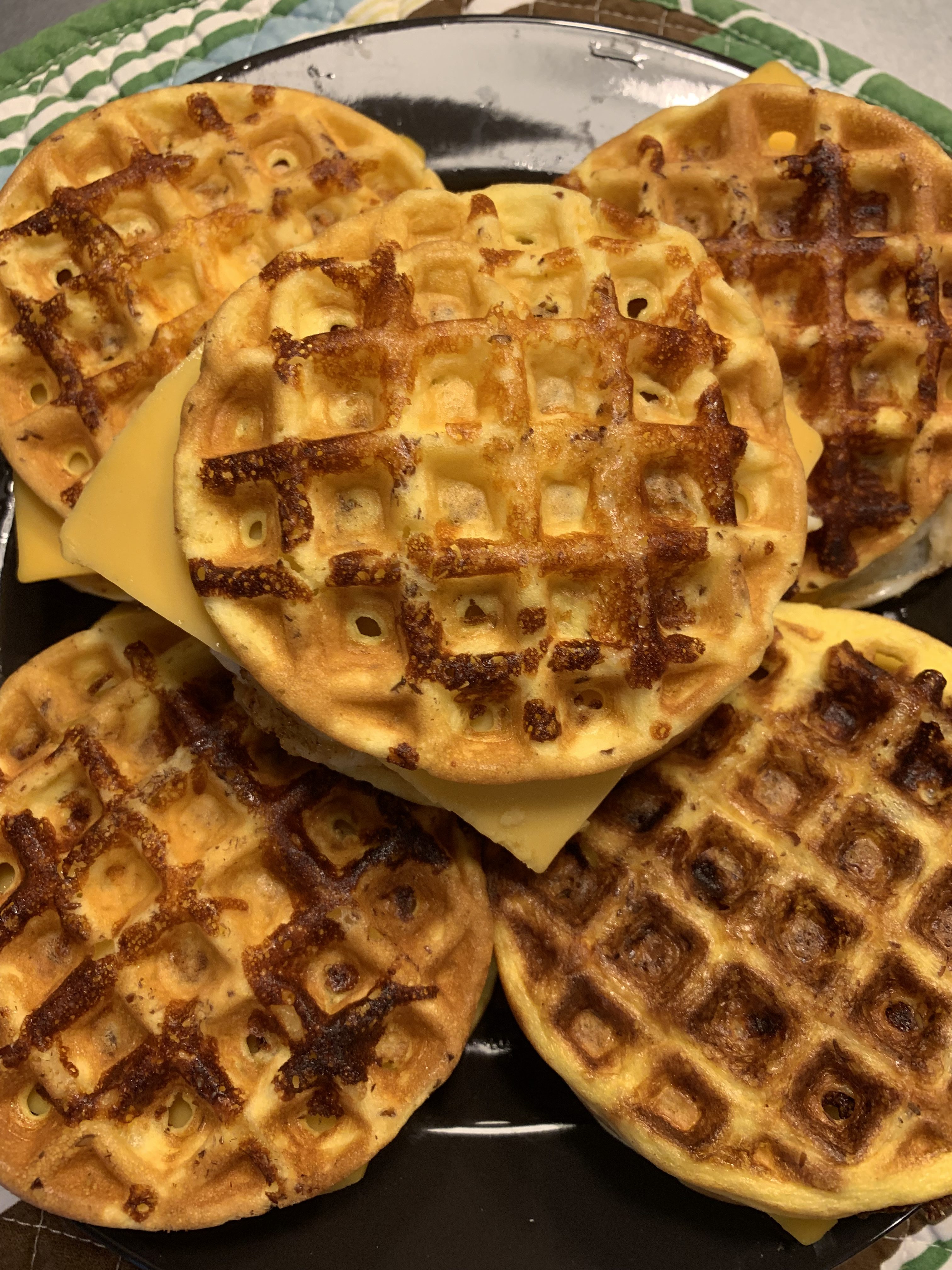 Repeat the process until you have ten chaffles. To make a sandwich, top a chaffle with a slice of Canadian bacon, then a fried egg, then a slice of American cheese (as always, the real stuff you get from the deli, not the Kraft singles nonsense), then another chaffle. Let them cool off and then store them in sandwich bags in the fridge. To reheat, put them on a plate and wrap them loosely in a paper towel, then heat for 30 to 40 seconds in your microwave.