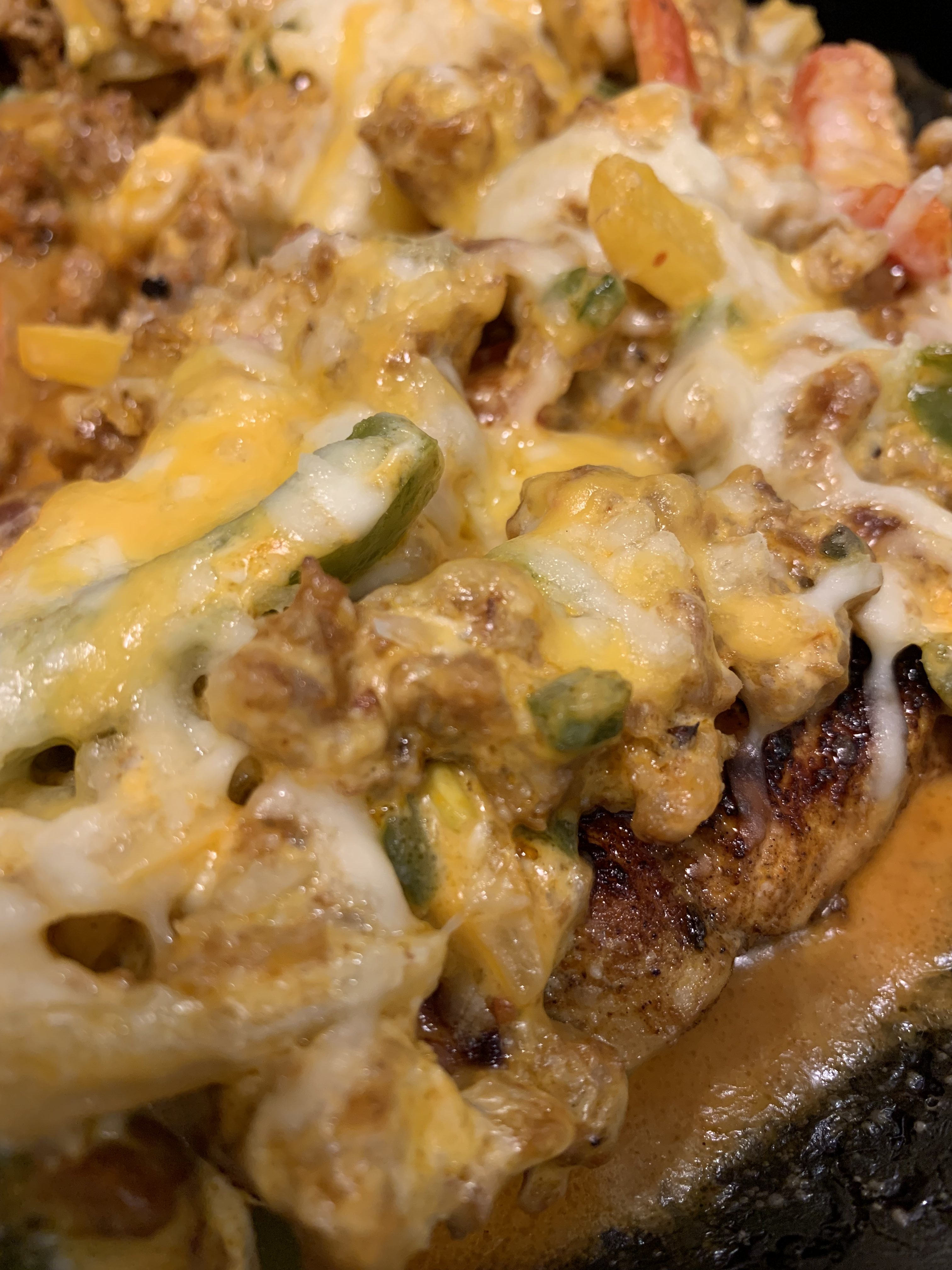Break the chorizo up with a spatula as it cooks, then add the peppers and onions. Flip the chicken after five minutes and set a timer for another five minutes. After flipping the chicken, add the cream cheese to the chorizo mixture and stir until it melts, then stir in the cream.